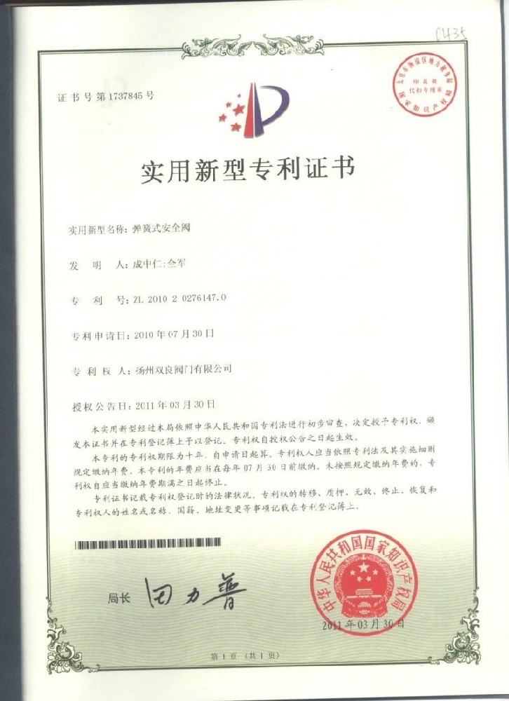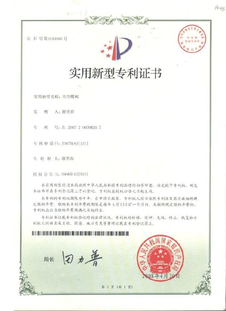 實用新型(xíng)專利證書