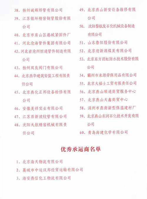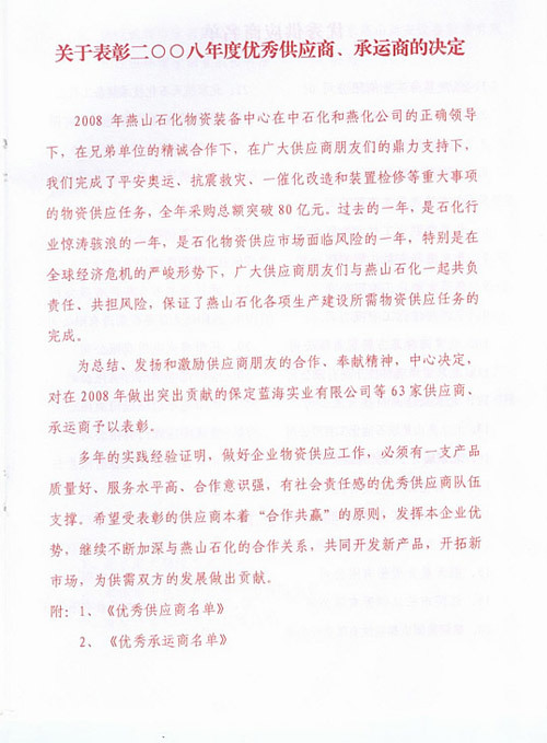 中石化(hua)北京燕山(shān)分公司2008年(nián)**供應商證(zhèng)書